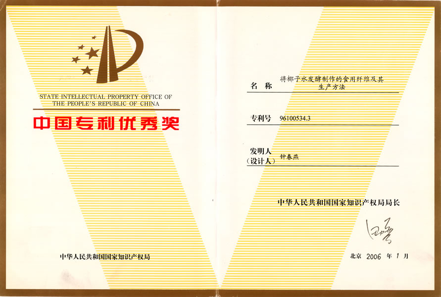 In 1996,an invention patent of the founder of the company,Ms.Zhong Chunyan,"The Dietary Fiber Fermentedfrom Coconut Water and Production Method"(patent number:96100534.3) ended Hainan Island's history of abandoning coconut water and polluting the environment for thousands of years and has created a brand new nata de coco industry with a production value of 2 billion a year.
